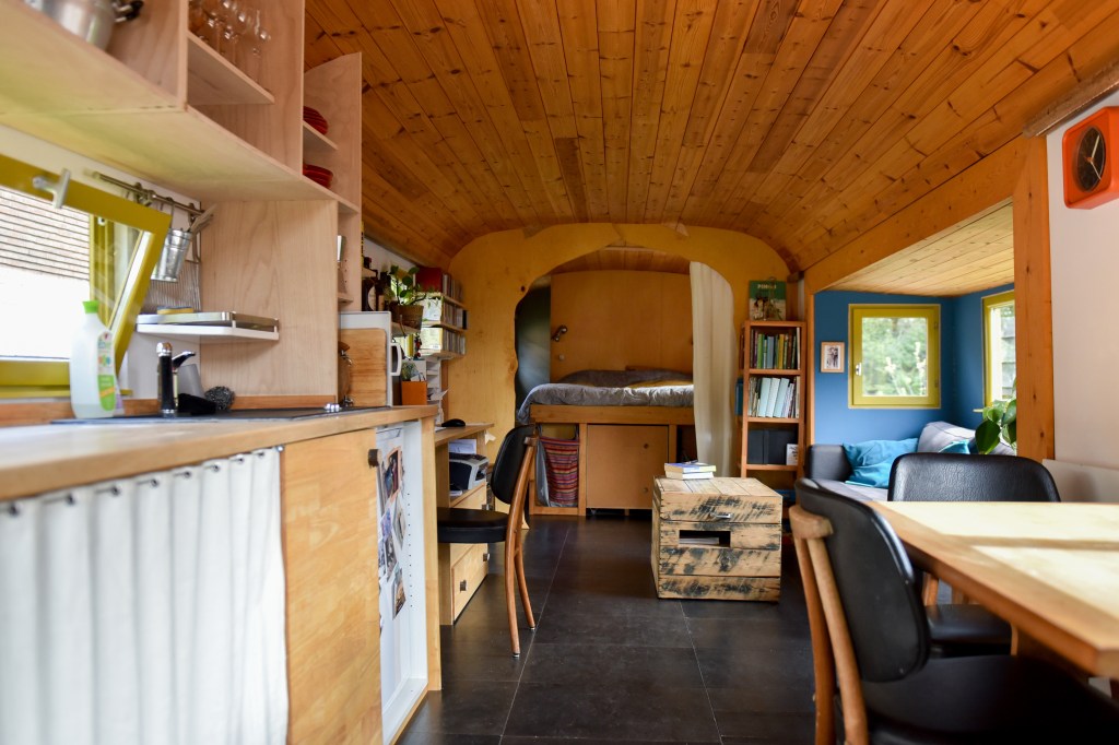 Een volledig gerenoveerde en afgewerkte woonwagen van 30 m², met keuken, slaapkamer, badkamer en alle voorzieningen van een kleine studio. Perfecte woonplaats voor een jong koppel dat op zoek is naar een alternatieve, kleine woonst.